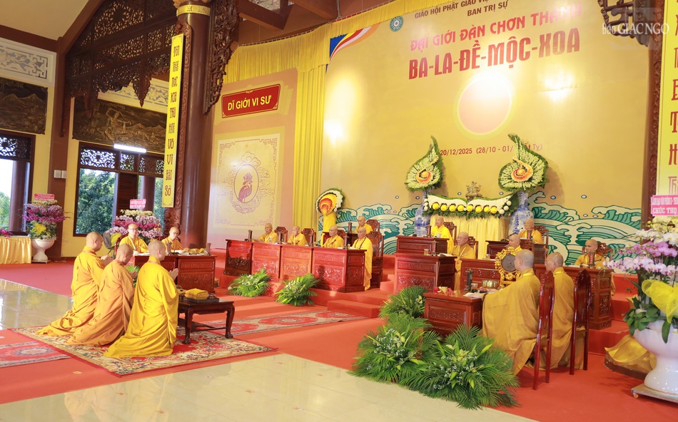 Theo đó, Hội đồng Thập sư đã trang nghiêm đăng đàn truyền giới Tỳ-kheo, Tỳ-kheo-ni, Thức-xoa-ma-na, Sa-di, Sa-di-ni cho các giới tử Đại giới đàn Chơn Thành Phật lịch 2569, tại giới trường thiền viện Trúc Lâm Chánh Thiện vào chiều 18-12.